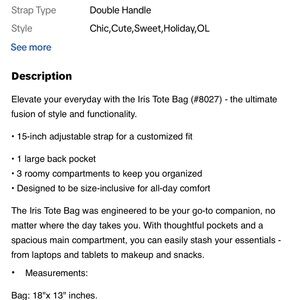 Beautiful bag several pockets machine washable hang dry. Can be used for do many things like shopping, Flea market? Beach bag etc…
