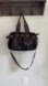 Stylish tote bag with black and brown design. Features multiple pockets and grommet details.