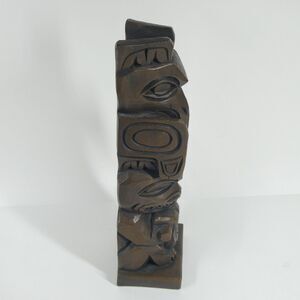 Vintage totem pole statue. About 13 inches tall. Made of dark brown ceramic, intended to look like wood. Has a sticker on the bottom from Ye Olde Curiosity Shop in Seattle. I believe the style is Alaskan; it is unsigned but looks similar to some Amos Wallace carved poles.
