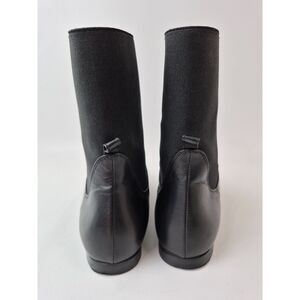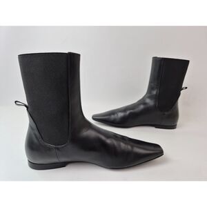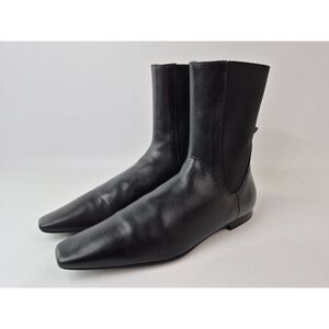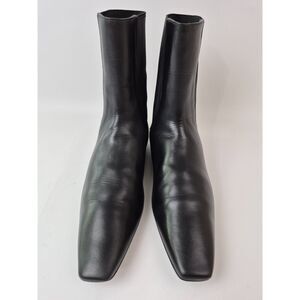 Sleek black leather ankle boots. Square toe design. Elastic side panels for easy wear.