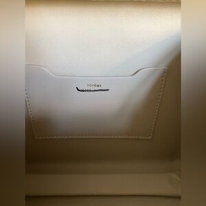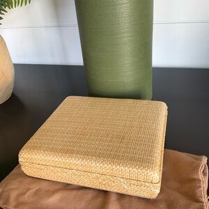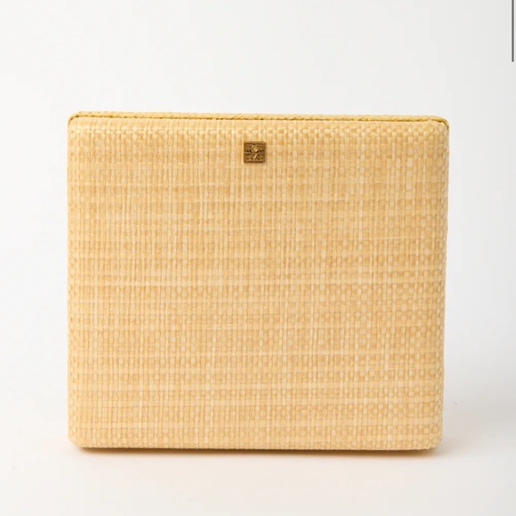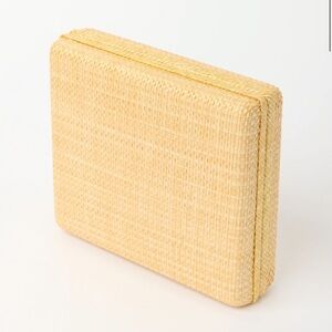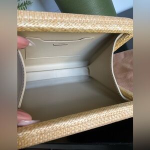 Luxurious raffia box clutch with cream leather interior with subtle stitching. Ideal for a refined look. New not used, one corner was repaired from in store handling, comes with dust bag, line by retailer.