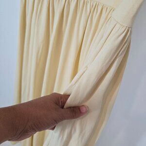 This Toteme piece is their Sleeveless Cotton Tee Dress, made of an 100% organic cotton jersey, in their Vanilla colorway (a sort of butter yellow/off white with a yellow undertone). It is a pullover, midi length, sleeveless dress with a round neck, side slip pockets, a fitted waist panel, and a flare skirt. It is also brand NEW wit tags! Such a beautiful, quiet luxury piece, and the perfect minimalist style piece to transition into fall with!