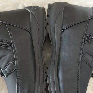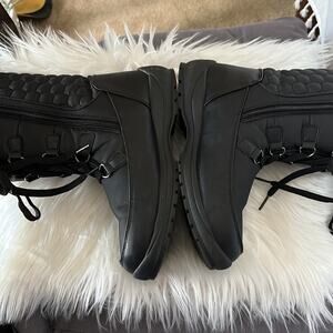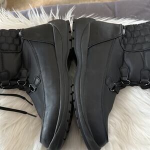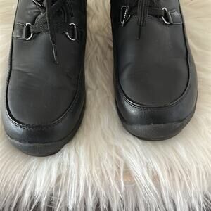 Black weatherproof boots. Has faux fur lining. Has zippers on the side for ease of putting one and off. In great used condition (very minor wear). One thing to point out is a puncture at the bottom of one of the sole from a pebble (see last pic). Does not impact the function of the boots.