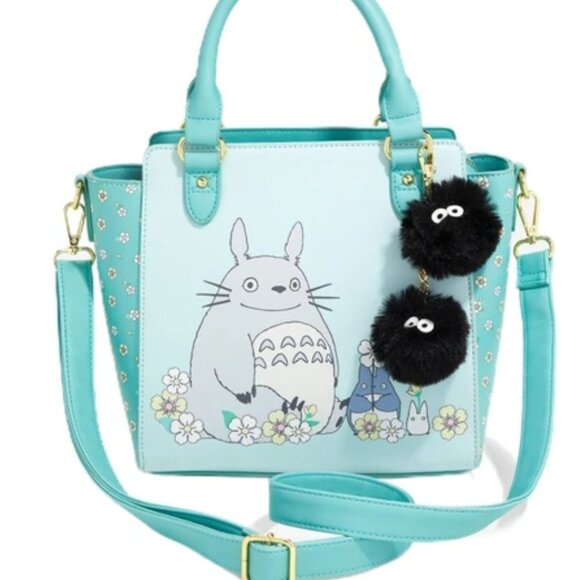 It features a print of Totoros with flowers, plus a removable fuzzy Soot Sprite key chain, and comes with the extra long strap seen in the first photo.