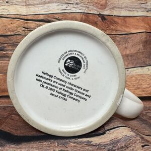 The product is a vintage coffee/tea mug featuring the character "Toucan Sam" from Kellogg's Fruit Loops cereal. Created in 2002, the white mug has a design that reflects the cereal theme. It was manufactured in China by Houston Harvest and is an original piece of advertising collectible.