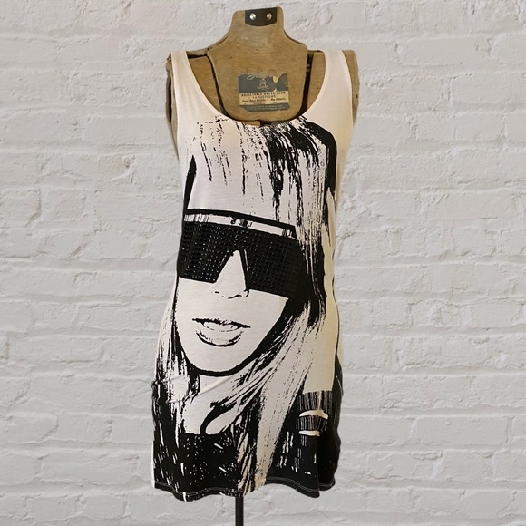 Touch Me 80s inspired girl with sunglass graphic print black and white tank top. Shiny dots embellish the shades. Size XL. In excellent used condition, from pet and smoke free home