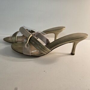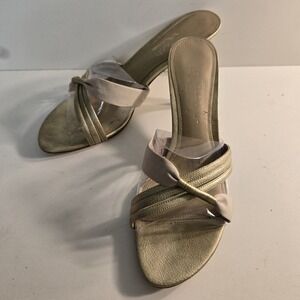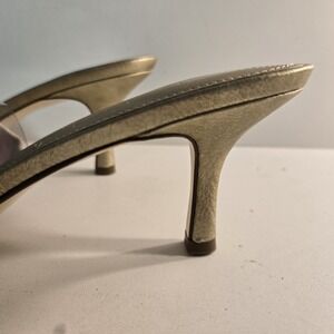 The Touch Of Nina Size 8.5 Gold Grail Formal Strappy Stiletto Heel is a stunning pair of women's shoes perfect for a variety of formal occasions. Featuring a solid gold color with a strappy design and stiletto heel, these heels are both stylish and elegant. The open toe and slip-on closure make them easy to wear, while the upper is a mixed material, both fabric and man-made, but the sole is leather. With a mid-height heel at 2.75 inches, these shoes are a great choice for summer and spring events, adding a touch of glamour to any outfit. These look never worn, no sole or heel marks. The footbed has several dings which look like they are from the packing materials. See pictures for details. These ship next business day in the original box. #20