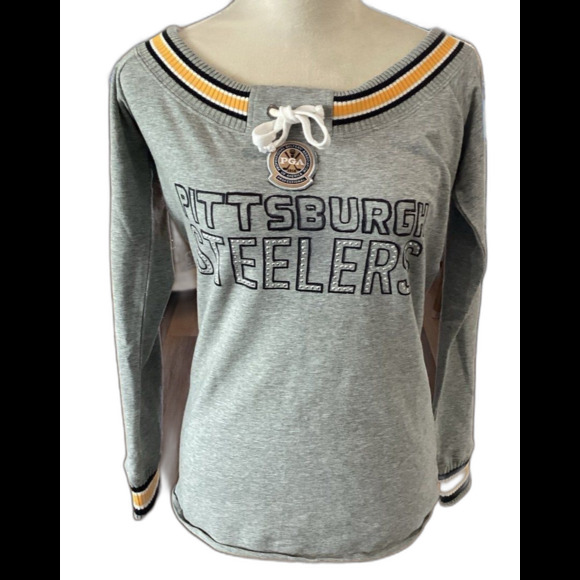 Pittsburgh Steelers “PGA” Ladies Size S Graphic Rhinestone Sweatshirt. LNWOT. PGA Patch , Draw Sting Neckline, Ribbed Cuffs and Color in Steeler Colors. Never Worn. Made by Touch Alyssa Milano