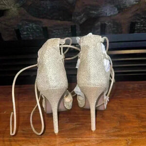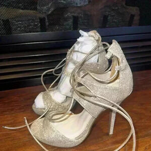 Elegant open-toe sandals in a light champagne gold color with a shimmery metallic finish, featuring multiple thin crisscross straps and ankle laces.
