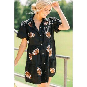 Touchdown Queen Gameday Poplin Button Down Football Dress in Black