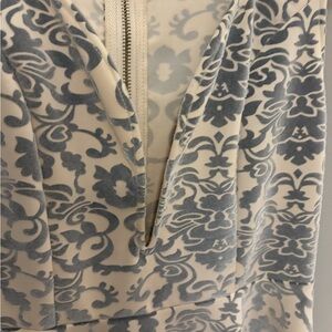 Elegant and eye-catching, this sleeveless dress features a chic cream base with a soft flocked gray velvet damask pattern. Designed with a flattering fit-and-flare silhouette and a full-length back zipper for easy wear. Made in France by Touché, this piece is perfect for special occasions or dressing up a night out.