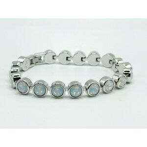 The Touchstone Crystal by Swarovski Ice Bracelet is a stunning piece of jewelry featuring lab-created/cultured round glazed white opal crystals from Austria. This bracelet is signed by the brand and plated with rhodium, making it a beautiful and elegant accessory for various occasions such as engagements, weddings, birthdays, and anniversaries. The fold-over clasp ensures a secure fit, and the nickel-free design makes it a safe choice for sensitive ears. Ideal for those who appreciate beauty, love, and fashion, this ice bracelet is both stackable and a timeless addition to any jewelry collection. Measures 7.25 inches. In excellent condition.