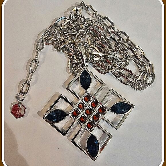 #Touchstone Crystal Gallery Pendant Necklace Blue & Amber Crystals Rhodium #NWOT