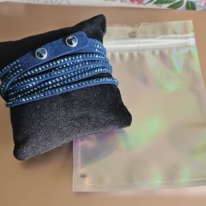Stylish blue wrap bracelet with sparkling rhinestones. Perfect for adding a touch of elegance.