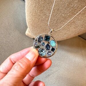 Smoke Free Home. Adjustable length 16" - 19". Indicolite Pacific Opal, Aquamarine, Light Sapphire and Denim Blue crystals. Rhodium plating.