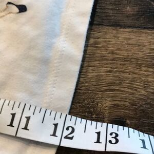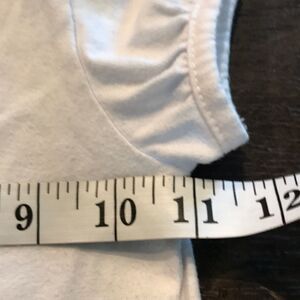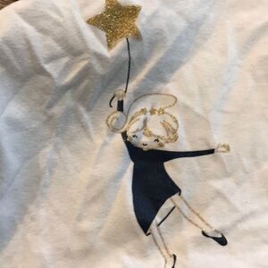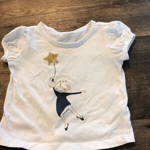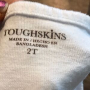 Tough Skins size 2 ruffle skirt and blue and white top set. The skirt is 100% polyester with a 9.5-inch waist (across) and 8.5-inch length. The top is 60% cotton, 40% polyester, and features a little girl holding a star balloon. The top is 12 inches long and 11 inches pit to pit.