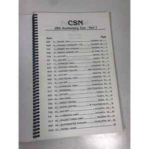 A Crosby Stills & Nash 1994 25th Anniversary Concert Tour, Part One, Itinerary Guide Book given to Crew Only. This book was given to roadies to tell them the schedule, where to be when, and who their contacts were in each city. Extremely Rare!