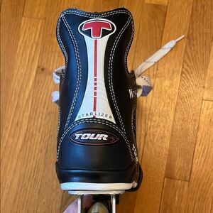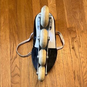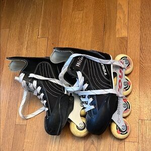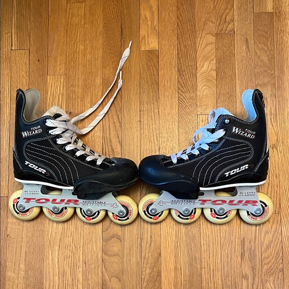 Tour Wizard inline skates. Adjustable sizes 12-2. Perfect for kids’ growing feet! These are great inline skates for kids who are starting out with skating. The skates are in very good used condition with signs of wear on toes and rollers (see photos).