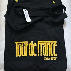 A black canvas bag with a vintage-style "Tour de France since 1903" design.