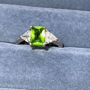 Peridot & Cubic Zirconia Three-Stone Emerald Cut 925 Silver Size 81/2.