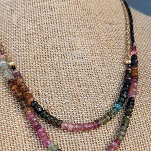Two strands of Tourmaline and tiny micro-faceted, black Spinel beads hang from a 14kt gold-filled chain.