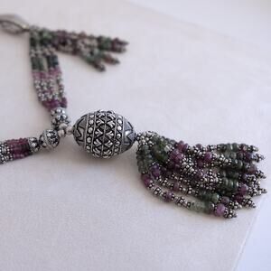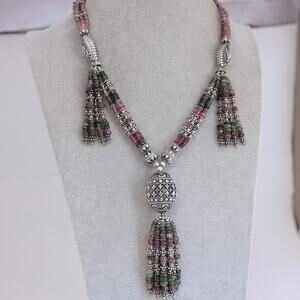 Tourmaline and Sterling Silver Tassel Necklace Multicolor Egg Shape Pendant