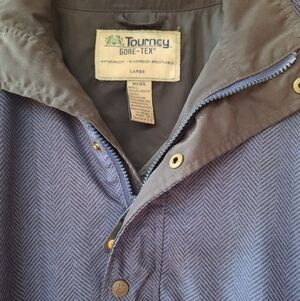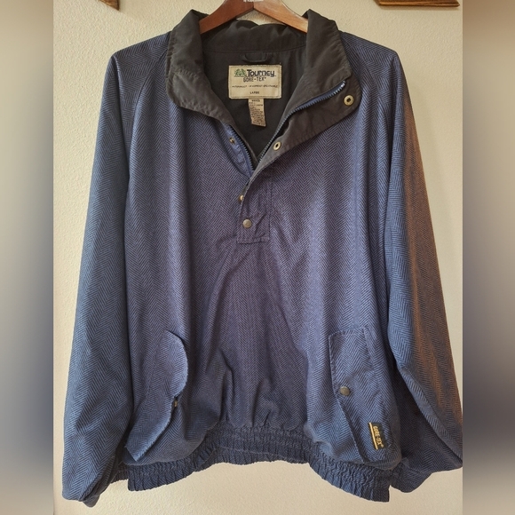 Tourney Gore-Tex Mens Golf Jacket. Herringbone pattern. Navy and black. WateBlack. wind proof and breathable. 1/4 Zip. Snap closure pockets. Elastic waistband. Size L Pit to pit flat lay 26" length from collar to hem 30" measurements are approximate