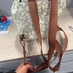 Chic and functional, this authentic Tous Kaos backpack features the brand's iconic multicolor "kaos" pattern on a durable coated canvas. Accented with leather trim and gold-tone hardware, it offers a spacious main compartment, interior pockets for easy organization, and adjustable shoulder straps for comfort. Perfect for everyday use, travel, or adding a playful touch to your outfit.
