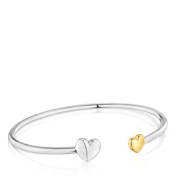 Tous My Other Half bangle in sterling silver and gold plating over silver. Heart motif sizes: 7 mm and 9 mm. Bracelet opening: 10 mm.