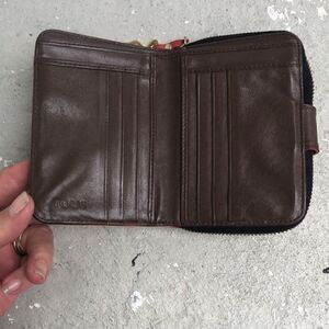 Cute small leather wallet zip around. Has a couple of marks that I showed in pictures so please check out the pictures. Leather is not damaged but needs clean up. Measures 5 x 3.75.
