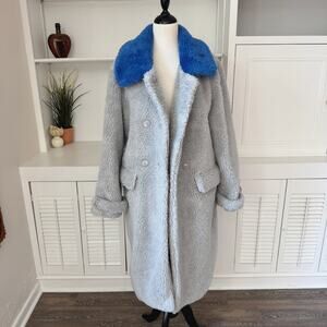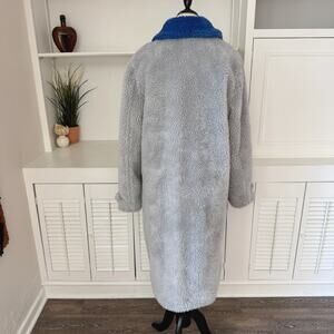 - light silvery grey furry teddy sherpa, collar in royal blue, long length, button front closure, flap pockets, lined