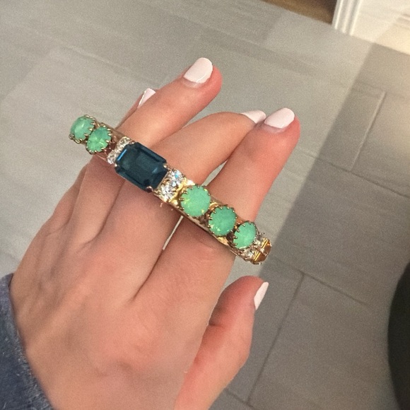 Elegant gold bracelet featuring emerald green round stones and a central teal rectangular stone. Polished gold setting with sparkling clear accents for refined shine. Stylish accessory that complements both casual and dress looks.