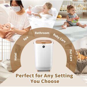 TMWINGS Towel Warmer, Bucket Style, perfect for indulging in warm towels, robes, or blankets. This electric warmer is ideal for use in bathrooms, spas, hot tubs, or by the pool. Featuring a sleek white finish with a wood-look lid and a stylish leather look handle. (new, never used, not in box)