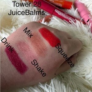 NIB Tower 28 Juice Balm in Drink and Squeeze. A buttery smooth, vegan tinted lip balm boosted with healthy ingredients and bursting with juicy color. Formulated with a nourishing shea butter base, each shade is made with good-for-you ingredients derived from fresh produce like mango seed oil, vitamin E, and Vitamin C. This soft, cushiony balm glides on lips and gives the perfect dewy sheen. New products.
