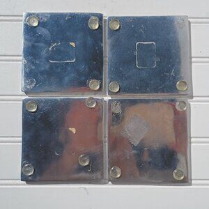 The tray is vintage and has scratches, but I have not polished. The coasters are missing a couple of the little rubber bumpers on the undersides (see pictures).
