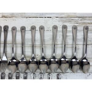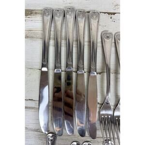 Towle Supreme Cutlery ENGLISH SHELL Stainless 36 Pc Flatware Set Japan. This set includes 5 dinner knives, 3 dinner forks, 8 table spoons, one butter knife, 11 teaspoons, and 8 salad or dessert forks. They have not been cleaned or polished in any way. See photos and video for details.
