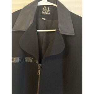 Super cool vintage Town & Travel Black Wool Blend structured overcoat with faux leather collar and faux leather grommet & zipper details to add a touch of edgy sophistication to this vintage design.