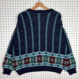 TownCraft Chunky Golf Sweater Women Large Nordic Knit Blue Green Pattern Grandma