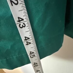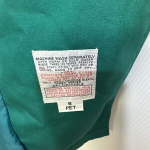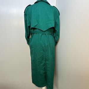 This vintage London Fog Towne Wamsutta trench coat in size 6 Petite features a stunning emerald green color, double-breasted front, notched lapel, and matching tie belt for a cinched waist. Classic epaulets, a back vent, and adjustable cuff straps round out the timeless silhouette. A striking addition to any outerwear collection, especially for fans of retro fashion.
