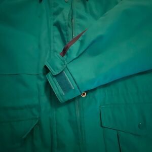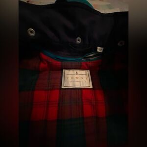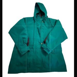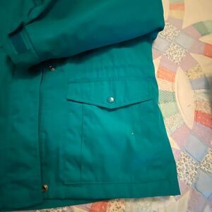 Towne from London Fog Teal lined jacked with removable hood, zippered, snapped Velcro can make waistlines cinched. This is a medium length jacket can be used by women or men made by London Fog from there a towne collection.