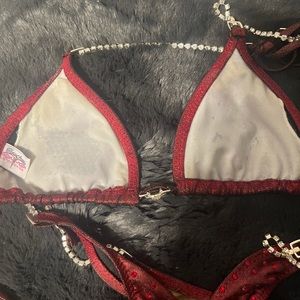 Toxic Angelz comp suit. This one has been worn and I have washed it before the stains are just from the bikini bite mixed with the tan. Original swavorski crystals (bought before they changed out for different crystals) Small top, 33inch hipbone measurement, 31 inch bust.