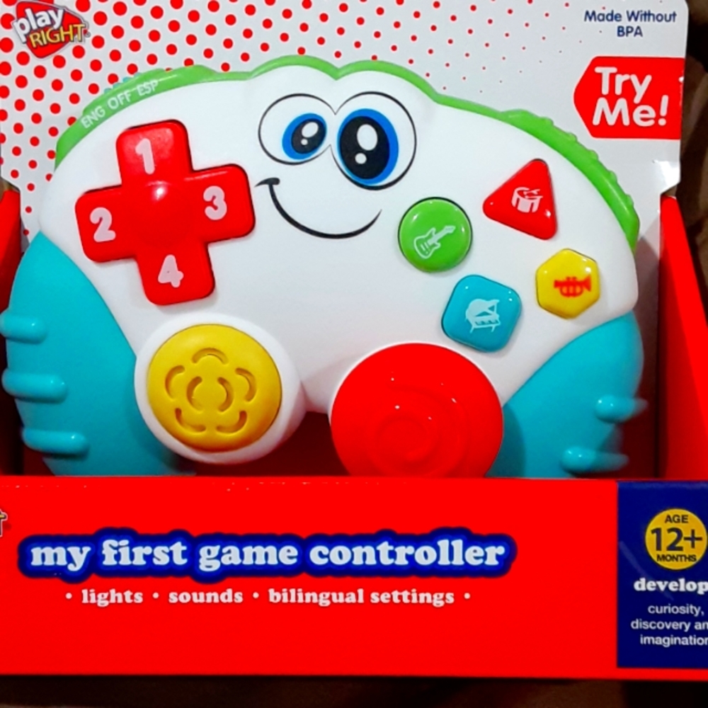 My First game controller for children 12 months+. Features include lights, sounds and it comes in bilingual settings English and Spanish. Learn numbers, colors and music instruments.