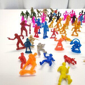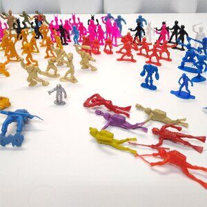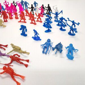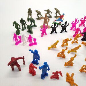 This delightful assortment of vintage toy soldiers and figures features a wide array of colors and poses, capturing the imagination of young and old alike. A nostalgic collection perfect for play or display, these plastic miniatures bring a touch of history and whimsy to any setting.