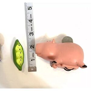 Bear, robot, peas in very good condition. Pig is not in good condition-missing a leg-chew marks. Push his coin down and he still moves.