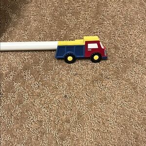 Brighten up your child's room with this colorful, expandable toy truck curtain rod. Truck themed finials on both ends. Finials measure 2 1/2 inches long and 1 1/2 inches tall. Featuring vibrant red, blue, and yellow colors. The rod is antique white. Accommodates windows 50”-96”. Originally purchased from Pottery Barn.