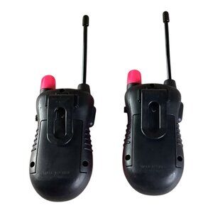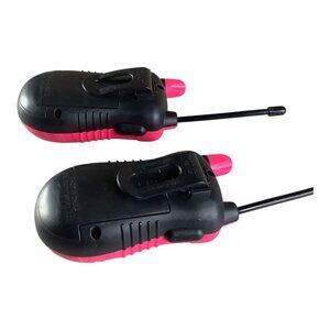 This pair of preowned kid-friendly walkie-talkies features pink accents and compact construction. Designed with integrated belt clips and a simple layout, they require new batteries to function.