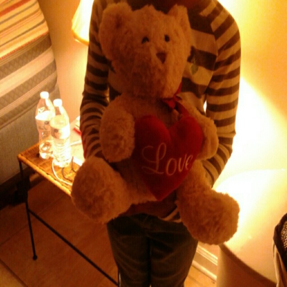 Toy bear that cream white furry bear that holding a heart in the middle of it chest that say love in the middle of it heart