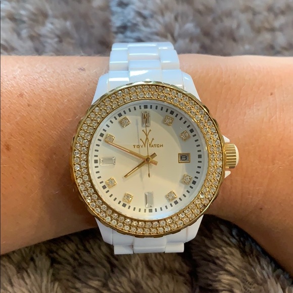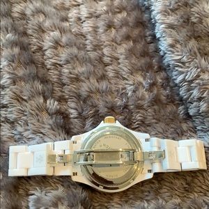 Beautiful super light weight white watch! Great condition💛I am going to say it has minor scratches but you wouldn’t be able to tell, water resistant. 46mm - needs new battery and doesn’t have extra links, fits small wrist.