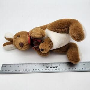 Australia Kangaroo Mother Joey Pouch Plush 10" Brown Fur Satin Bow Stuffed Animal Toy