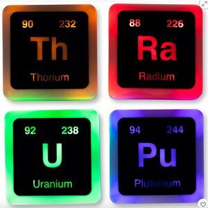 Put the elements from the periodic table to your table! Enjoy a glass of your favorite beverage and place it on these chemistry-inspired coasters featuring the symbols of Radium-226, Plutonium-244, Uranium-238, and Thorium-232. Place a drink on them and watch them light up! Durable plastic construction.